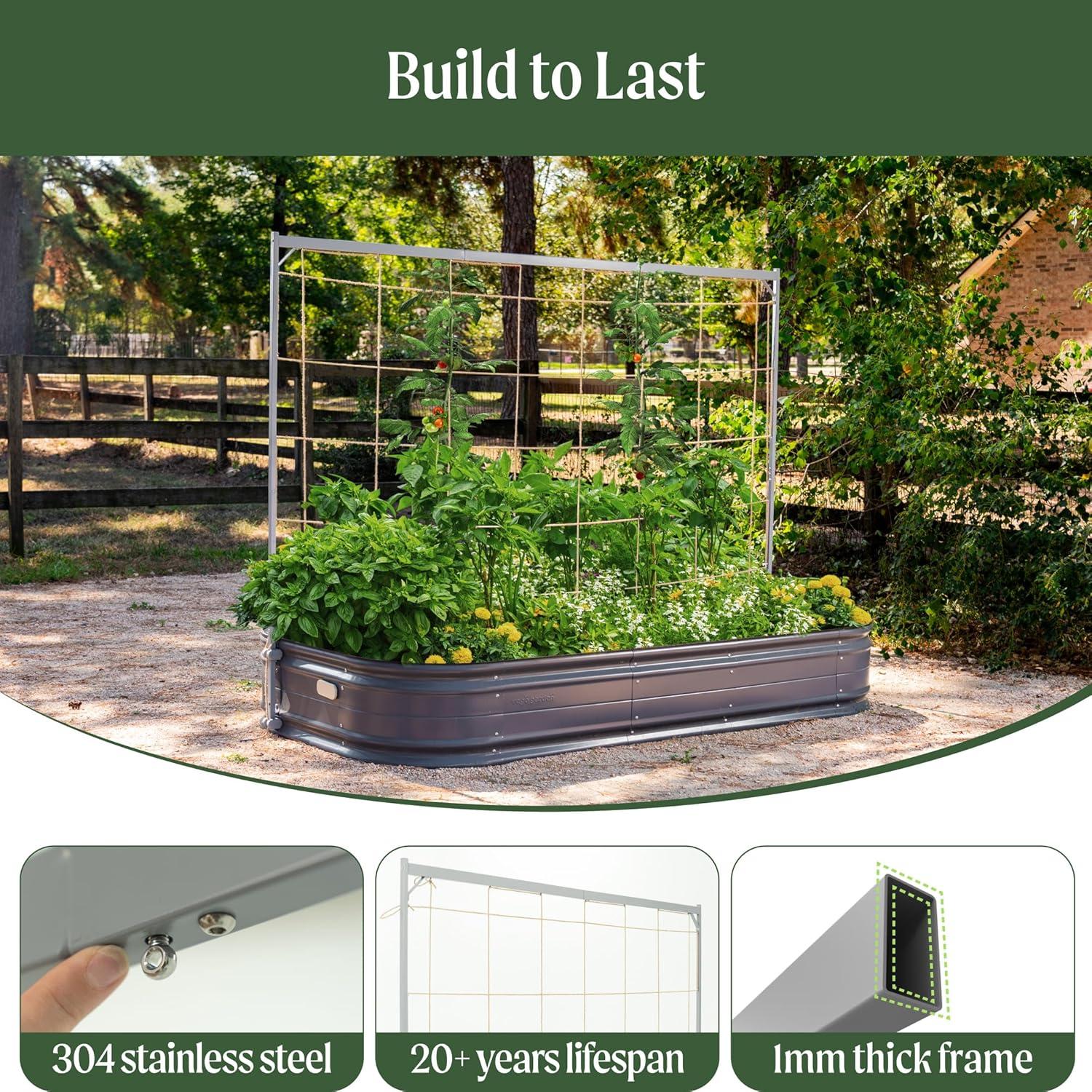 Vego Garden's popular 17″ tall 9-in-1 planter and 6.5' wide metal trellis allows you to set up a 3.5' x 6.5' vertical planting bed to maximize your growing space. This setup is perfect for growing climbing plants like potatoes, beans, and vines.